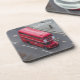 An aerial photograph of a red bus in London printed on a set of souvenir coasters.