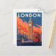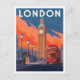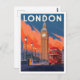 A beautifully painted vintage-style travel poster of London, England. The scene features the iconic Big Ben and Houses of Parliament under a dramatic, colorful sky, with a classic double-decker red bus driving past. This romantic illustration is perfect for Anglophiles and collectors of vibrant cityscape artwork.