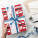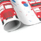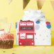 This wrapping paper features an iconic red London bus with party balloons and confetti - perfect for a kid's birthday present.