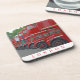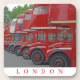 A beautiful photograph of London red buses parked in a row printed on a set of souvenir coasters.