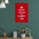 This classic "Keep Calm and Carry On" print is available as a poster or as a canvas print. This poster features white text on a classic "London" red background.