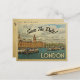 Vintage London Save The Date postcards featuring Westminster Abbey on the River Thames for this English United Kingdom scene. This cool mid-century retro design is the perfect way to gather guests to your London England UK destination wedding.