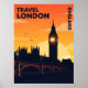 A vibrant sunset casts a warm glow over the silhouette of London's famous landmarks, including Big Ben and Westminster Bridge.