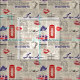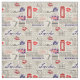 A London themed seamless pattern inspired by news papers. The "text" is actually grey dots. There background is a grey beige colour. In the pattern there are red phone booths, blue leaves, red kiss marks, "London" written in blue script font, "tea" written in grey script font, grey leaves, grey vintage style suitcases and grey sketch like teacups with steam coming up from them. There is also Union Jack in colour.