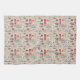 A London themed seamless pattern inspired by news papers. The "text" is actually grey dots. There background is a grey beige colour. In the pattern there are red phone booths, blue leaves, red kiss marks, "London" written in blue script font, "tea" written in grey script font, grey leaves, grey vintage style suitcases and grey sketch like teacups with steam coming up from them. There is also Union Jack in colour.