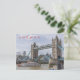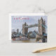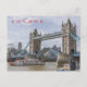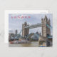 A beautiful view of Tower Bridge in London lifted to let a boat sail through it printed on a postcard.