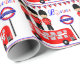 Such a cute design in red white and blue; London theme with little Buckingham Palace Queen's Guards standing in a row; under Union Jack Bunting flags, London text with the famous London Eye symbol and a big red double decker bus. A very British fun design.