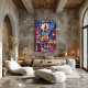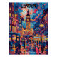 This vibrant illustration portrays London at night through a bold, colorful cityscape centered around Big Ben and bustling streets. Expressive brushwork, glowing lights, and dynamic urban energy create a modern artwork that captures the rhythm of the city after dark. Ideal for contemporary interiors, city lovers, and statement wall art collectors.