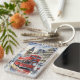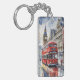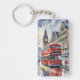 This keychain features a watercolor portrait of a double decker bus in London, England.