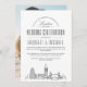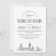 It features a modern deco-style illustration of the city's skyline resting towards the bottom. Centred above this are the names of the wedding couple and your wedding day information in matching open-lined style text. The text elements of this are framed by a square line border enveloping it. This is all together presented in a neutral black and white, classic colour theme.