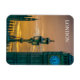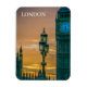 A beautiful view of a lamppost on Westminster Bridge in London and a partial view of the Elizabeth Tower at sunset printed on a souvenir fridge magnet.