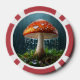 A single mushroom stands sturdy and straight under a heavy rain, water beading on its cap and dripping off the sides onto short blades of grass and moss.