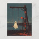 A haunting Halloween scene of a ghost sitting alone on a seaside swing under a red moon. Perfect for fans of eerie vintage art and mysterious Halloween vibes.