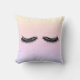 Long black eyelashes with eyeliner on a pair of closed eyelids on a soft textured pink and yellow background.