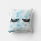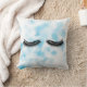Long black eyelashes with eyeliner on a pair of closed eyelids on an aqua and white bokeh pattern.
