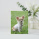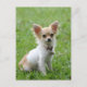 Aww...who can resist the sweet face of a Chihuahua puppy dog? This fun canine postcard features an image of a happy long hair Chihuahua puppy dog sitting in the green grass.