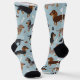 Cute long haired dachshunds with black and tan, black, red, chocolate, blue and dapple coats with scattered paw prints and dog bones pattern.