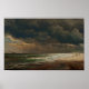 A stretch of sandy beach curves along the coast of Long Island, where gentle waves lap against the shore under a hazy sky. In the distance, sailing vessels drift along the horizon, their sails catching the soft breeze. Near the water’s edge, figures walk and rest, leaving footprints in the sand. The beach is dotted with seaweed, driftwood, and scattered rocks, and the atmosphere is one of calm, salty air and ocean rhythm.