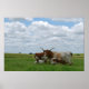 A baby longhorn samples some lunch while mum relaxes under the blue Kansas sky.
