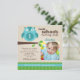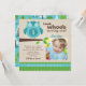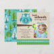 Celebrate your little one's first birthday with this playful owl photo invitation featuring "Look Whoo's Turning One!" in aqua blue and brown. A charming illustrated owl perches on a branch beside a framed space for your child's photo, with fun green and blue striped accents. The back showcases a whimsical pattern of colorful trees in coordinating aqua, green, and brown tones. All text is fully customizable to fit your party details.