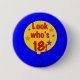 A yellow balloon, confetti stars, and text that reads "Look Who's 18!" on a blue background on 18th birthday cards, buttons, and more!