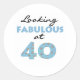 Black and light blue text that reads "Looking Fabulous at 40" on Fabulous 40 T-shirts, mugs, mousepads, buttons, and other items that make great gifts for the person turning 40 years old, and they can be worn the entire year!