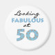 Black and light blue text that reads "Looking Fabulous at 50" on Fabulous 50 T-shirts, mugs, mousepads, buttons, and other items that make great gifts for the person turning 50 years old, and they can be worn the entire year!