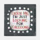 An irreverent typographic animal design that says "Excuse Me, I'm Just Looking For Raccoons". It features black and red text on a white rectangle with funky, playful white dots surrounding it, all on a grey background.