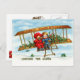 Cute and funny vintage Christmas illustration of two kids in a glider aeroplane looking for Santa Claus with binoculars. They are all bundled up in their winter coats and the glider is decorated with holly leaves and berries.