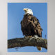 A bald eagle on a tree branch gazing skyward as if in thought. The image is enhanced by the bright blue sky.