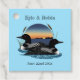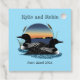 A pair of loons on the lake with a warm sunset behind them, all set against a blue backdrop