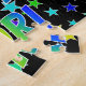 This lively and fun birthday-themed jigsaw puzzle design features the message "HAPPY BIRTHDAY, LORI" with the characters having a colourful rainbow spectrum inspired gradient pattern, along with an exciting field of stars background pattern. An exciting puzzle like this might be a fun way to send birthday wishes to somebody named Lori. [~Z0000468]