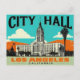 A bold vintage-style illustration of the iconic Los Angeles City Hall in California. The artwork features striking colours of turquoise, orange, and cream, highlighting the building’s historic architecture framed by palm trees and mountains.