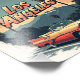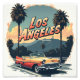 A vintage t-shirt design featuring the text "Los Angeles" in bold retro typography. Below, a classic convertible driving through the city streets is framed by a grunge-styled circular border. The background includes faded palm trees and the Hollywood sign in muted colours