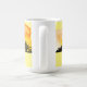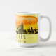 Coffee mug features Los Angeles California city skyline silhouette with sunset watercolor splash and latitude & longitude coordinates on pale yellow background.