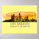 Poster features Los Angeles California city skyline silhouette with sunset watercolor splash and latitude & longitude coordinates on pale yellow background.