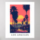 Bold, retro-style poster of Los Angeles featuring palm trees, a glowing sunset, and the city skyline in vibrant colors and dreamy tones.