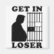 Funny political gift refrigerator magnet for garage beer fridges in the progressive man cave. Black graphic of a portly and corrupt Donald J Trump going to prison for all his crimes. "Get in loser".