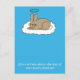 A cute cartoon rabbit with a halo above it's ahead, sitting on a cloud in a bright blue sky.