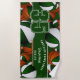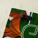 This sports themed beach towel for basketball players features a bunch of varied size basketballs that have green & white panels turned every which way on a green background - personalise with the athlete's name & jersey number plus team name & mascot name - by katz_d_zynes