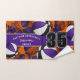 This team spirit towel for basketball players features varied size basketballs with black & purple team colours turned every which way, overlying a customisable basketball-orange background, and prominent jersey number in purple overlying a full length black colour strip, upon which you can also customise the athlete's name, team name & mascot name in white - by katz_d_zynes