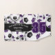 This team spirit towel for soccer players features varied size soccer balls with purple & black team colours turned every which way on a white background and prominent jersey number in purple overlying a full length black colour strip, upon which you can also customise the athlete's name, team name & mascot name in white - by katz_d_zynes