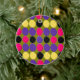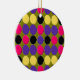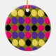 This bright pendant is covered in lots of spots of purple, pink yellow and black arranged in rows separated by areas of dark green. This fantastic abstract brings to mind a wall covered in splodges of paint after a paintball game.