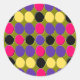 This bright set of round stickers is covered in lots of spots of purple, pink yellow and black arranged in rows separated by areas of dark green. This fantastic abstract brings to mind a wall covered in splodges of paint after a paintball game.