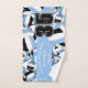 This athletic towel for volleyball players features varied size light blue, black & white volleyballs turned every which way on a white background and prominent jersey number in black overlying a bold, full length light blue colour strip, upon which you can also personalise the athlete's name, team name & mascot name - by katz_d_zynes