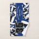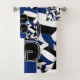 This cool towel set for a volleyball player features varied size blue, black & white volleyballs turned every which way on a white background and prominent jersey number in black overlying a bold, full length blue colour strip, upon which you can also personalise the athlete's name, team name & mascot name - by katz_d_zynes