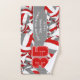 This cool towel set for a volleyball player features varied size red, grey & white volleyballs turned every which way on a white background and prominent jersey number in red overlying a bold, full length grey colour strip, upon which you can also personalise the athlete's name, team name & mascot name - by katz_d_zynes