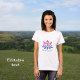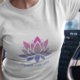 This t-shirt has a blue-pink coloured lotus flower design, and the caption "PEACE AND LOVE" in co-ordinating blue. Edit this text for your own preferred wording. Relax, breathe, comfort.