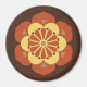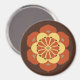 Japanese mandala design round magnet that depicts a stylised lotus flower, symbolising purity, spiritual awakening and faithfulness - flower in rust orange / terracotta and golden yellow, accented with tan, on a dark chocolate brown background