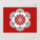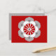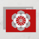 Japanese mandala design postcard that depicts a stylised lotus flower, symbolising purity, spiritual awakening and faithfulness - flower in silver grey / grey, red and white, on a dark Chinese red background